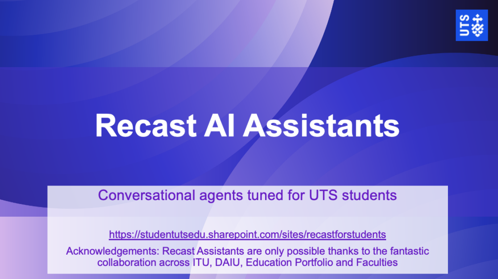 This slide deck gives a snapshot of pedagogically-tuned conversational agents deployed in the UTS Recast enterprise AI platform, which are grounded in the research of CIC members, often in collaboration with faculty colleagues: