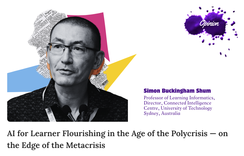 CIC’s Simon Buckingham Shum was honoured to be invited to contribute, with an opinion piece sketching his current thoughts on how we may think of AI for learning in these turbulent times, when it often feels like both human and natural systems are unravelling: